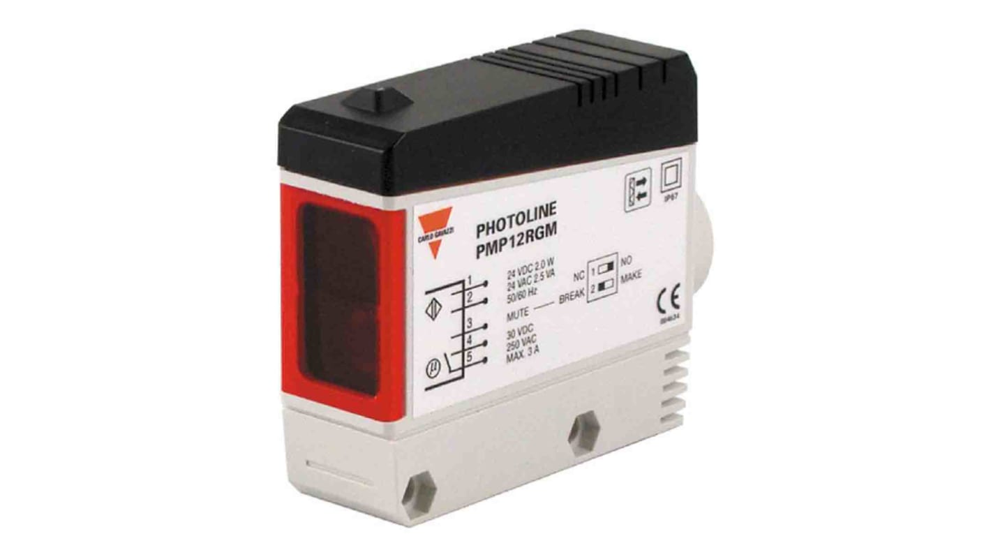 Sensore fotoelettrico rettangolare Carlo Gavazzi PMP12RGM, rilevamento fino a 12 m, uscita selezionabile NC/NO, indicazione LED.