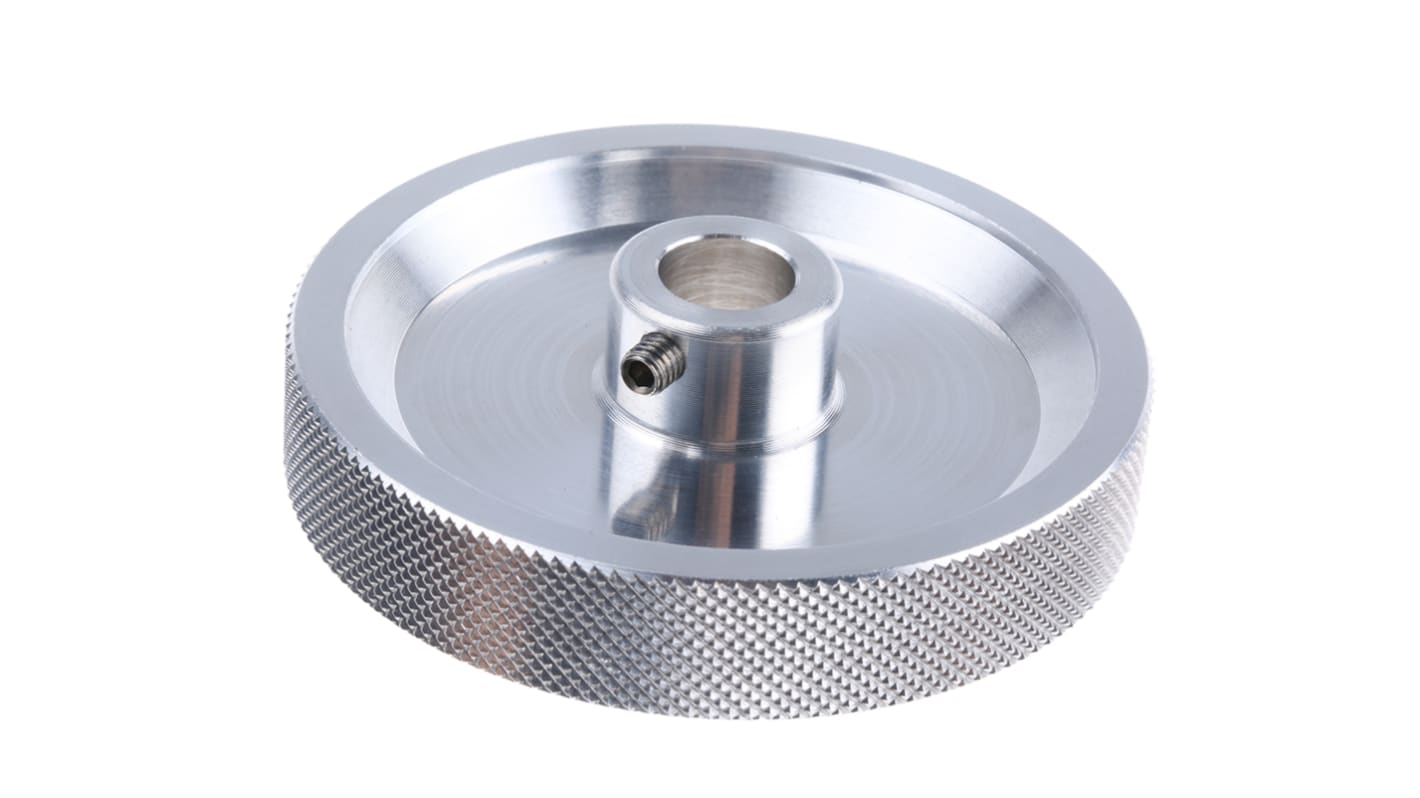 Ruota per encoder Baumer MR211.10A in alluminio, circonferenza 20 cm, foro 10 mm, superficie zigrinata, include staffa di montaggio.