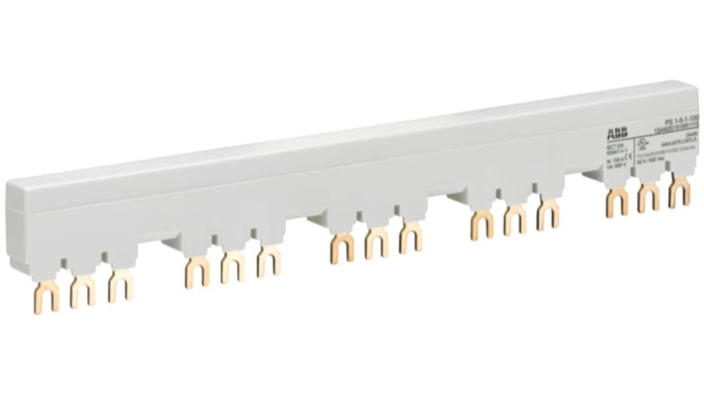 Barra di distribuzione trifase ABB, 690V ca, per collegamento rapido e sicuro di 5 starter per motori manuali MS132 o MS116, con 1 contatto ausiliario laterale. Corrente nominale 100 Amp, grado di protezione IP20, compatibile con accessori MS116/MS132, fase elettrica 3. Codice costruttore 1SAM201916R1115.