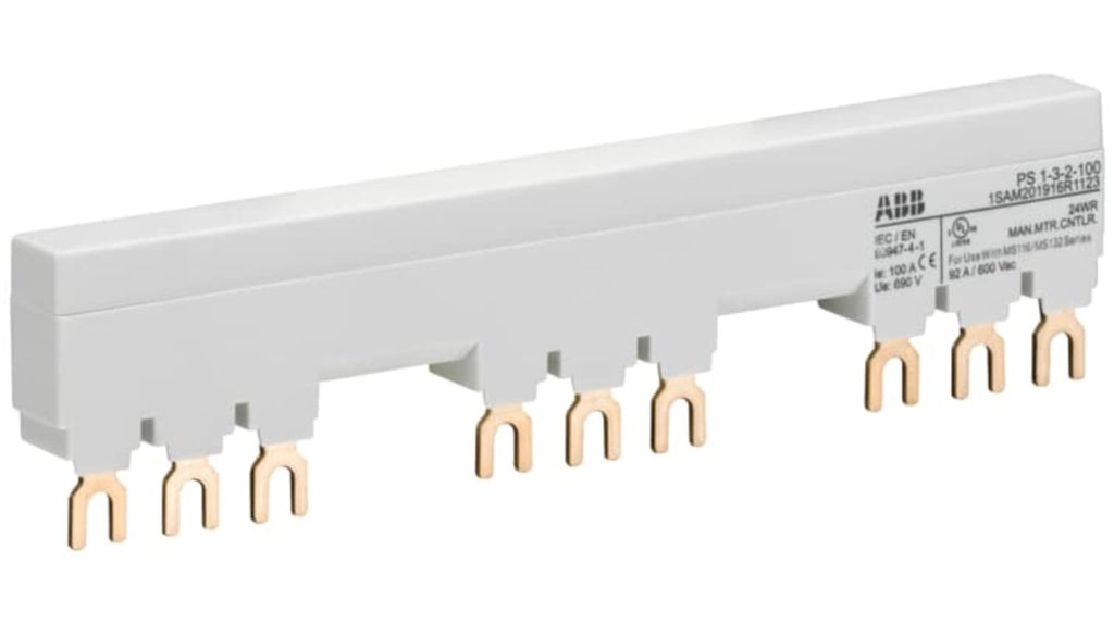 Coperchio barra di distribuzione trifase ABB, tensione nominale 250 V dc, 400 V ca, corrente di esercizio 100 A, 9 poli, grado di protezione IP20, temperatura operativa da -25 a +70 gradi Celsius, collegamento a forcella, compatibile con MS116 e MS132. Codice costruttore 1SAM201916R1123.