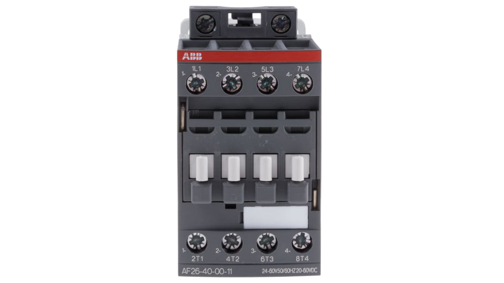 Contattore ABB, serie AF, 4 poli, 4 NA, 45 A, 11 kW, bobina 24 V ca/cc, tensione nominale contatto 690 V c.a., protezione incorporata contro i transitori, gestione di grandi variazioni della tensione di comando, dimensioni 45 mm x 86 mm x 101 mm, temperatura operativa da -40 a +70 gradi Celsius, tipo terminale a vite. Codice costruttore 1SBL237201R1100 AF26-40-00-11.