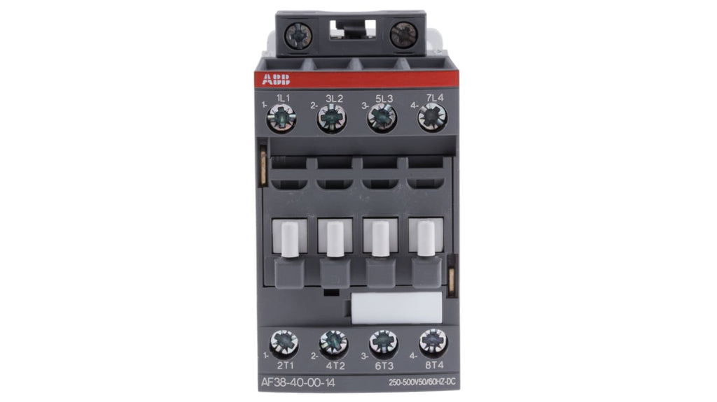 Contattore ABB, serie AF, 4 poli, 4 NA, 55 A, 18,5 kW, bobina 250-500 V ca/cc, tensione nominale contatto 690 V c.a., protezione incorporata contro i transitori, gestione di grandi variazioni della tensione di comando, dimensioni 45 mm x 86 mm x 101 mm, temperatura operativa da -40°C a +70°C, tipo terminale a vite, codice costruttore 1SBL297201R1400 AF38-40-00-14.