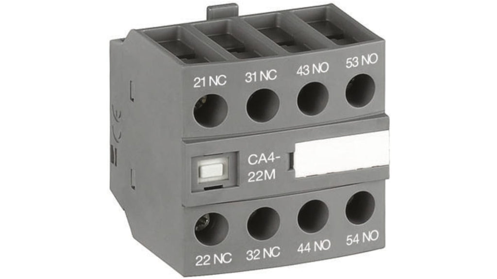 Contatto ausiliario ABB, 4 contatti, 1NC + 3NO, montaggio anteriore, serie CA4, corrente nominale 6 A, tensione nominale 600 V c.c., 690 V c.a., tipo terminale a vite, configurazione polo e corsa 4P, standard UL 508, CSA C22.2 N14. Compatibile con contattori AF.