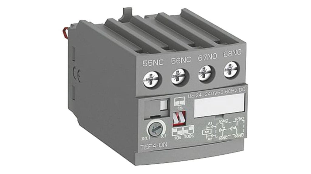 Relè contattore temporizzatore ABB, serie TEF4, 2 poli, 1 NO + 1 NC, 3 A. Tensione nominale contatto 240 V c.a., corrente nominale contatto 3 A, range di temperatura operativa -25 °C a +70 °C. Dimensioni 67,7 mm x 43 mm x 41,6 mm, montaggio a pannello, terminali a vite. Funzione di ritardo ON, tensione di controllo 24 a 240 V. Resistenza agli impulsi 4 kV.