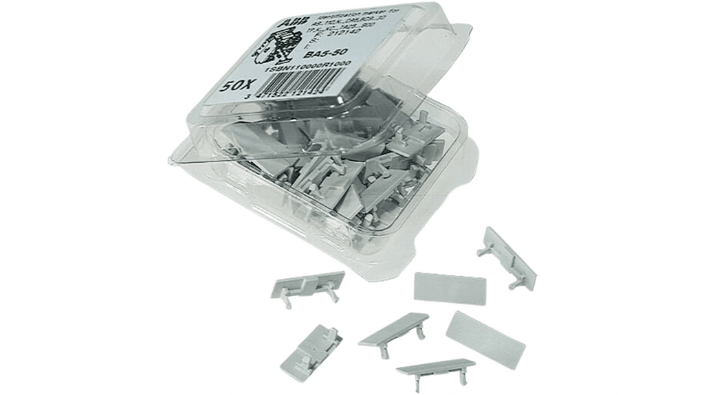 Contattore per uso con Serie AF, AX, NX, TAL e UAF, TNL. Codice costruttore 1SBN110000R1000, marchio ABB. Tipo accessori, marcatore funzione. Dimensioni indicatore di funzione 19,8 x 7,5 x 4,5 mm. Confezione da 50 pezzi. Accessori A-Line per corrente inferiore a 100A.