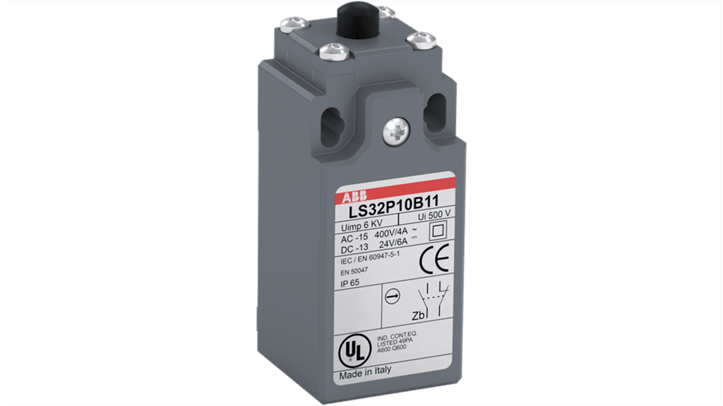 Interruttore di fine corsa ABB, attuatore a pistone, configurazione 1NA/1NC, protezione IP65, tensione massima 400V ca, custodia in plastica rinforzata con fibra di vetro, 30 milioni di operazioni con valore B10d, 2 fori di montaggio superiori, ingresso cavo Pg11 inferiore. Codice costruttore 1SBV010110R1211.