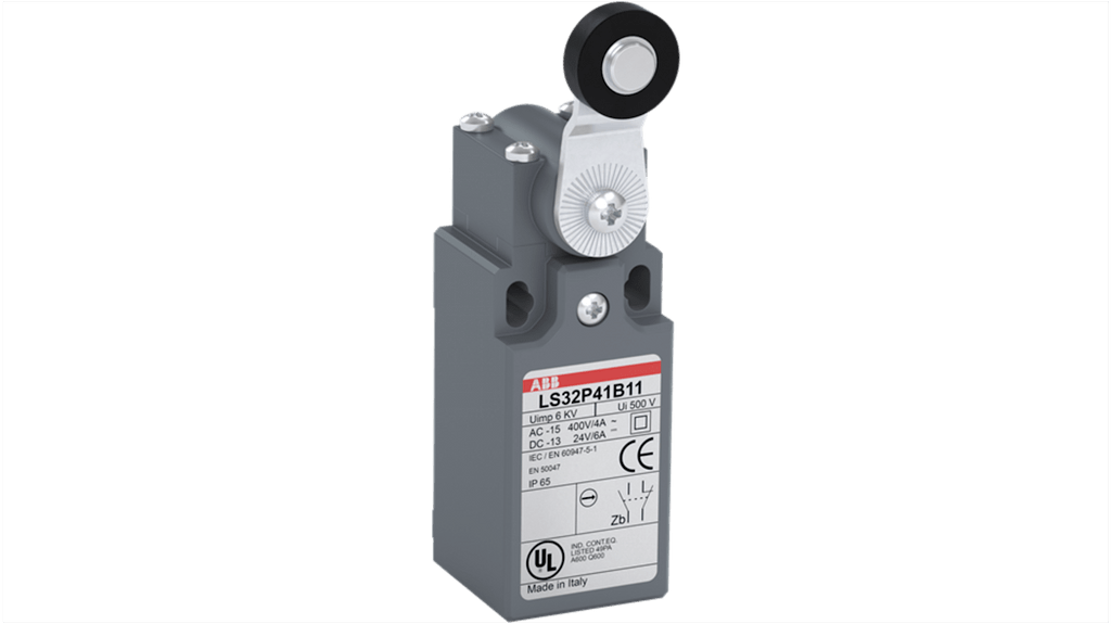 Interruttore di fine corsa ABB, leva a rullo, 1NA/1NC, 400V ca, IP65. Materiale custodia in plastica con fibra di vetro, dimensioni 30 mm, 2 fori di montaggio superiori, ingresso cavo Pg11. Attuatore con leva a rullo di diametro 18 mm, 30 milioni di operazioni con valore B10d, conforme a IEC 60529.