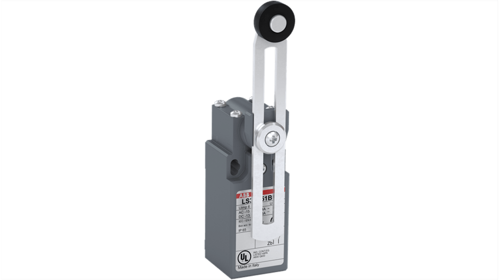 Interruttore di fine corsa ABB, leva con rotella regolabile, 1NA/1NC, 400V ca, grado di protezione IP65. Materiale custodia in plastica rinforzata con fibra di vetro, 2 fori di montaggio superiori, ingresso cavo Pg11. Durata operativa di 30 milioni di cicli, conforme a IEC 60529. Dimensioni larghezza 30 mm.