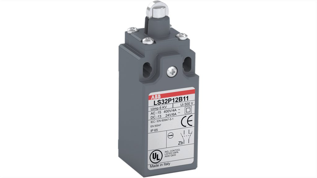 Interruttore di fine corsa ABB, leva a rullo, 1NA/1NC, 400V ca, grado di protezione IP66, materiale UL-V0 rinforzato con fibra di vetro, attuatore a pistone in acciaio, 30 milioni di operazioni con valore B10d, 2 fori di montaggio superiori, ingresso cavo ISO M16x1.5. Codice costruttore 1SBV010312R1211.