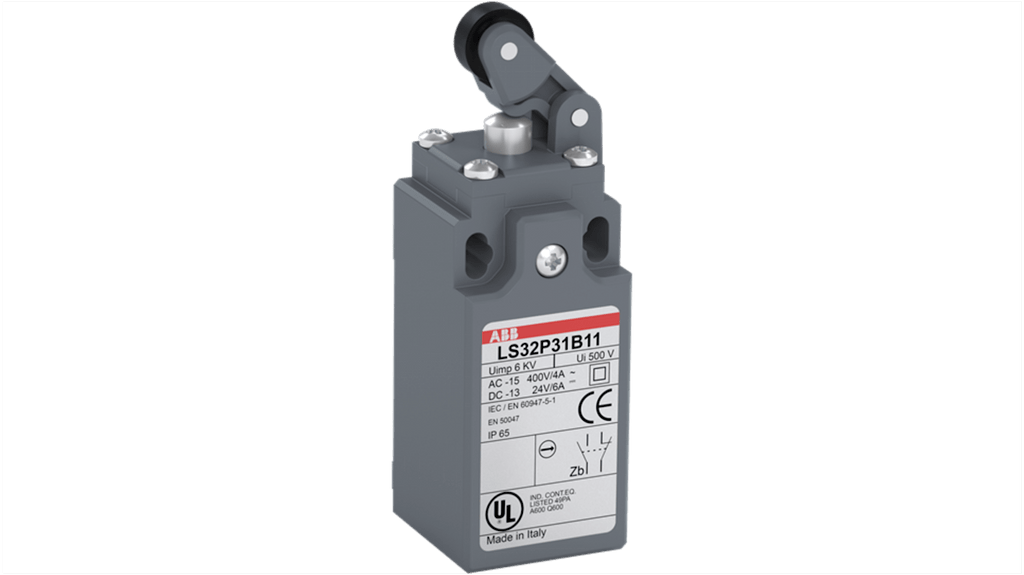 Interruttore di fine corsa ABB, attuatore a pistone, 1NA/1NC, protezione IP65, tensione massima 400V ca, materiale custodia in plastica rinforzata con fibra di vetro, 30 mm di larghezza, 2 fori di montaggio superiori, ingresso cavo ISO M16x1.5, leva a rulli in plastica Ø 12,5 mm, 30 milioni di operazioni con valore B10d. Codice costruttore 1SBV010331R1211.