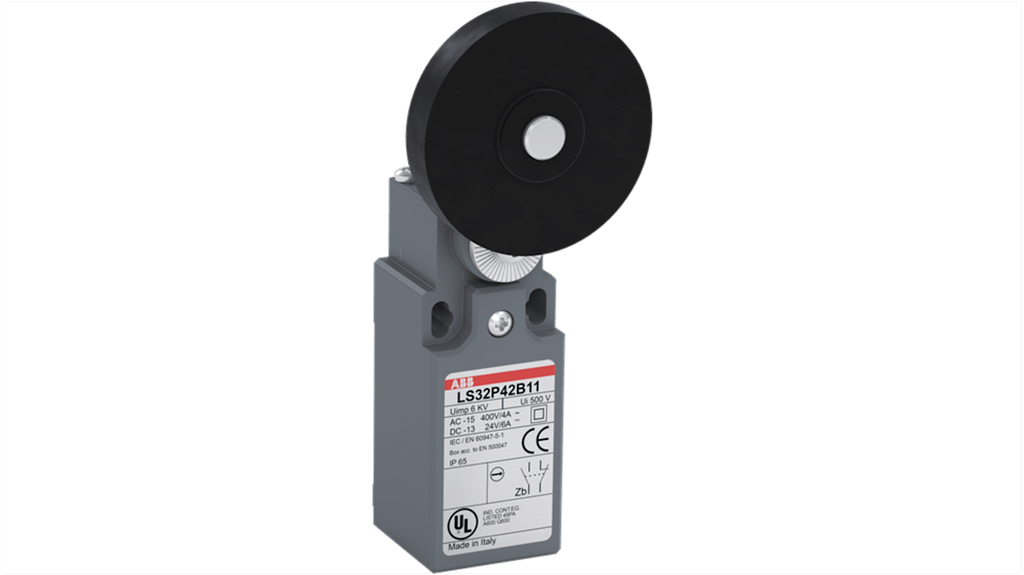 Interruttore di fine corsa ABB, leva a rullo, 1NA/1NC, 400V ca, IP65. Materiale custodia in plastica con fibra di vetro, dimensioni 30 mm, 2 fori di montaggio superiori, ingresso cavo ISO M16x1.5, attuatore con leva a rullo in gomma (Ø 50 mm). 30 milioni di operazioni con valore B10d, grado di protezione conforme a IEC 60529. Codice costruttore 1SBV010342R1211.