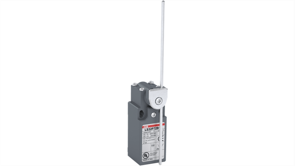 Interruttore di fine corsa ABB, leva a rullo, 1NA/1NC, 400V ca, IP65. Materiale custodia in plastica rinforzata con fibra di vetro, larghezza 30 mm, 2 fori di montaggio superiori, ingresso cavo ISO M16x1.5, leva ad asta regolabile Ø 3 mm. 30 milioni di operazioni con valore B10d, conforme a IEC 60529.