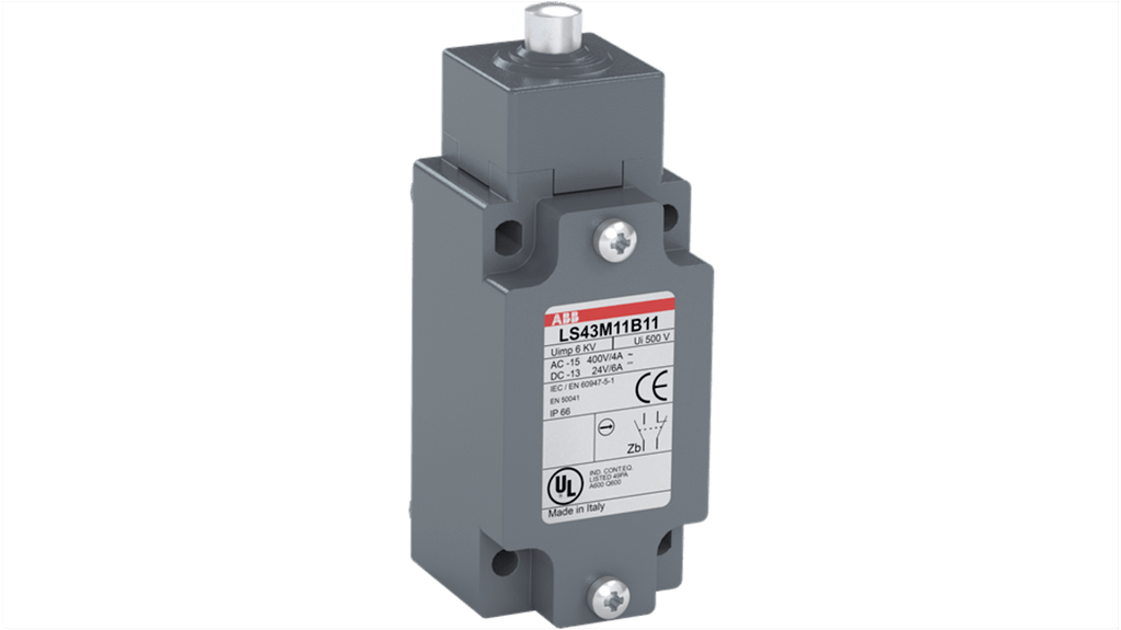 Interruttore di fine corsa ABB, attuatore a pistone, 1NA/1NC, 400V ca, grado di protezione IP66, custodia in lega di zinco, 4 fori di montaggio, ingresso cavo ISO M20x1.5, 50 milioni di operazioni con valore B10d. Dimensioni 40 mm di larghezza. Codice costruttore 1SBV011611R1211.