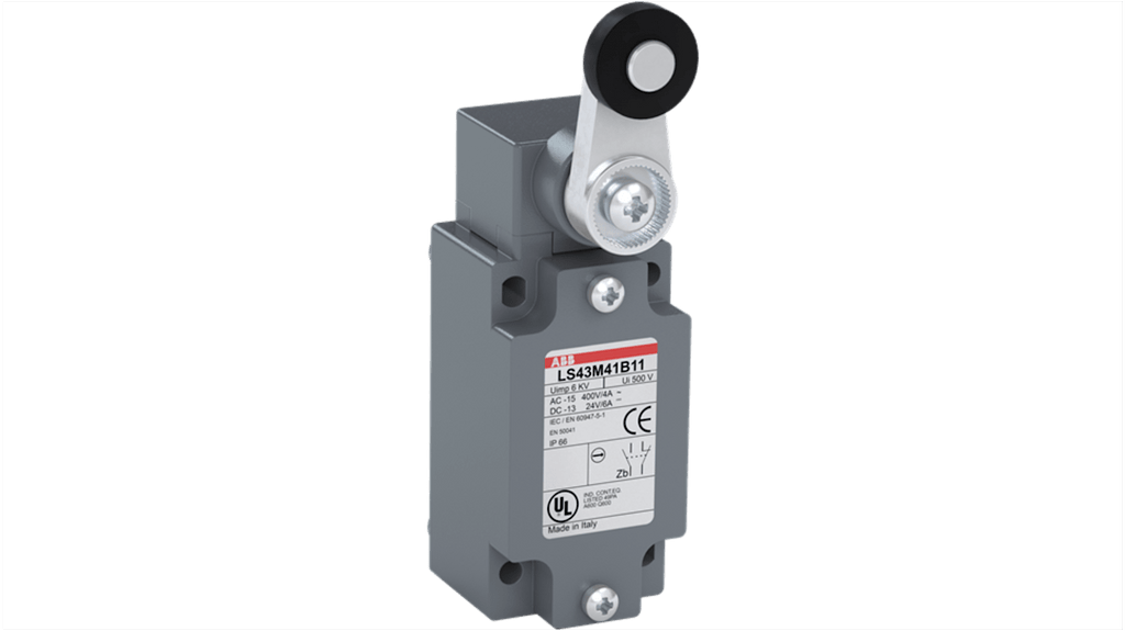 Interruttore di fine corsa ABB, attuatore a rullo, corrente massima 10A, tensione massima 600V, grado di protezione IP66, realizzato in lega di zinco, 4 fori di montaggio, ingresso cavo ISO M20x1.5, attuatore con leva a rotella in plastica Ø22 mm, contatti N.O. e N.C. tipo ZB, temperatura operativa -25 a -70 gradi Celsius, stoccaggio -30 a -80 gradi Celsius.