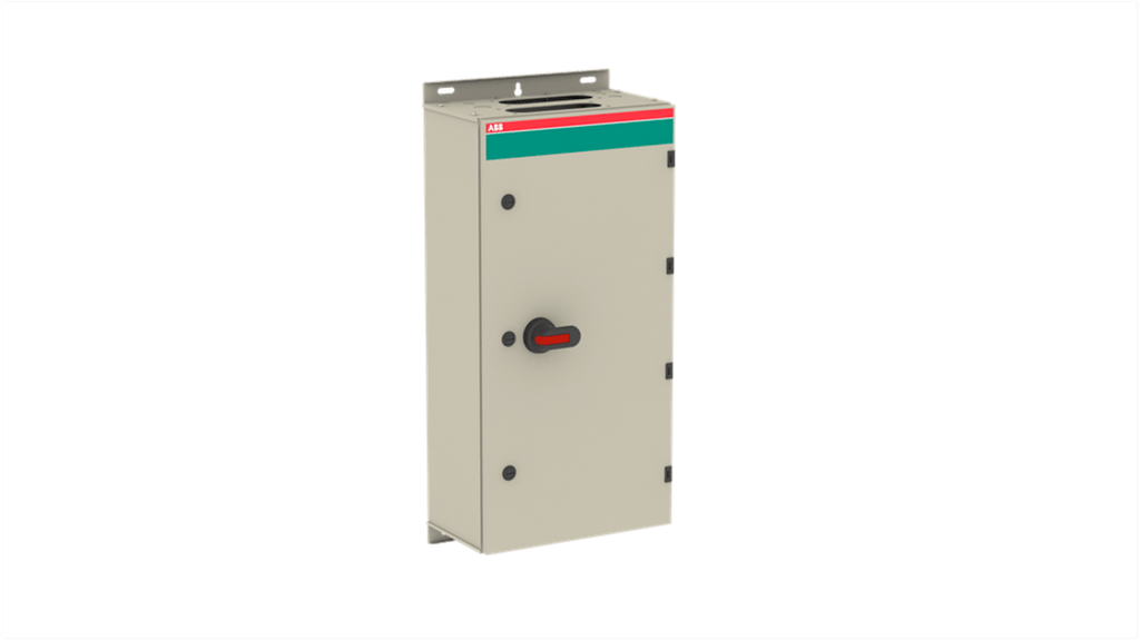 Sezionatore con interruttore, 3 poli, corrente massima 400A, tensione nominale 1000 V, contatti ausiliari 2NA/1NC, montaggio a vite, grado di protezione IP65, contenitore in acciaio galvanizzato con rivestimento in poliestere, predisposto per cavi singoli e paralleli, funzione di rilascio della pressione del gas, impugnatura bloccabile per 3 lucchetti, coperchio con blocco interno. Modello 1SCA022281R6070, serie OT.