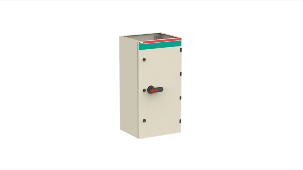 Sezionatore con interruttore ABB, 4 poli, corrente massima 400A, montaggio a vite, protezione IP54, potenza nominale 230kW, configurazione stato normale NO, serie OT, contenitore in lamiera d'acciaio galvanizzato con rivestimento in poliestere, manico nero, funzione di rilascio della pressione del gas incorporata. Adatto per uso all'aperto, protezione da raggi UV. Codice costruttore 1SCA022292R6680.