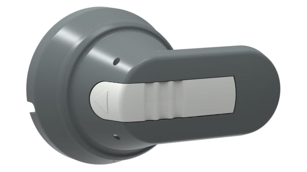 Manopola rotante per sezionatore OT16, colore grigio, lunghezza 65mm, grado di protezione IP65, bloccabile con tre lucchetti in posizione OFF, blocco interno porta in posizione ON, fissaggio a vite posteriore, assenza di viti anteriori per doppio isolamento. Codice costruttore 1SCA022399R7720, marchio ABB.
