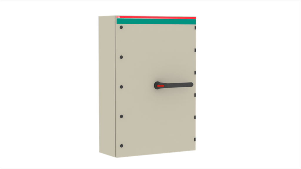 Sezionatore con interruttore ABB, 4 poli, corrente massima 570A, montaggio a vite, protezione IP54, potenza nominale 315kW, configurazione stato normale NO, contenitore in lamiera d'acciaio galvanizzato con rivestimento in poliestere, adatto per uso all'aperto, funzione di rilascio della pressione del gas integrata, impugnatura nera a pistola. Codice costruttore 1SCA022475R1180, serie OT.