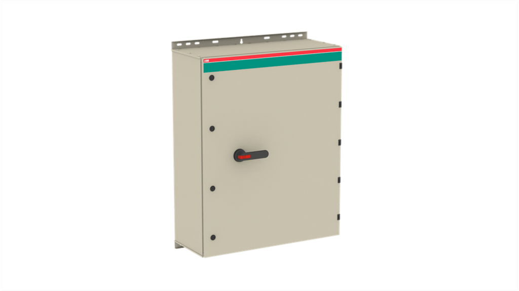 Sezionatore con interruttore, 4 poli, corrente massima 570A, tensione nominale 1000 V, configurazione 4NA/4NC, montaggio a vite, grado di protezione IP54, contenitore in acciaio galvanizzato con rivestimento in poliestere, predisposto per cavi singoli e paralleli, funzione di rilascio della pressione del gas, impugnatura bloccabile, coperchio interbloccato. Codice costruttore 1SCA022475R1340, serie OT.