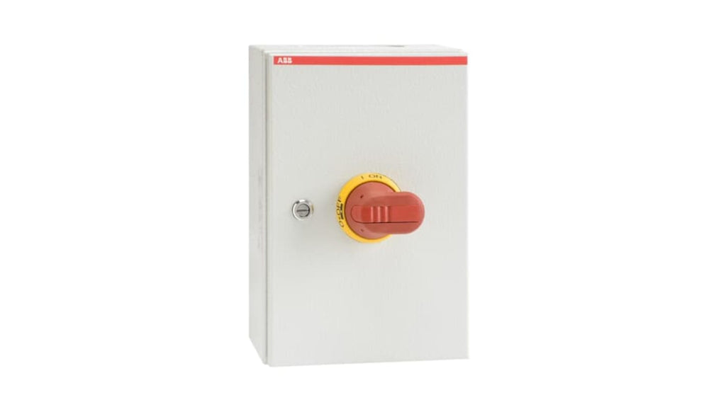 Sezionatore con interruttore ABB, serie OTL, 6 poli, normalmente aperto, corrente massima 63A, potenza nominale 22kW, montaggio a vite, grado di protezione IP65, realizzato in acciaio zincato-alluminio con rivestimento in polvere poliestere, sportello incernierato con serratura, coperchio interbloccato, adatto per uso esterno, conforme a UL746C.