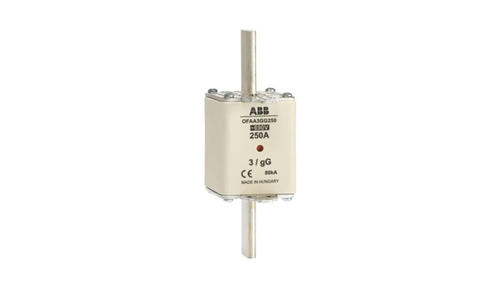 Fusibile con linguette ABB gG HRC, corrente nominale 355 A, dimensioni 150 x 51 x 84 mm, tensione nominale 690 V, standard CE, collegamento fusibile tipo DIN, perdita di potenza 32 W, adatto per protezione da sovracorrente e cortocircuito, funzionamento continuo. Codice costruttore 1SCA022701R1180.