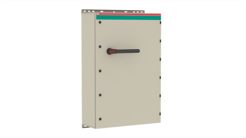 Sezionatore con interruttore ABB, 3 poli, corrente massima 1000A, montaggio superficiale, protezione IP65, potenza nominale 560kW, configurazione stato normale NO, contenitore in lamiera d'acciaio galvanizzato con rivestimento in poliestere, impugnatura a pistola nera, funzione di scarico della pressione del gas incorporata, adatto per uso all'aperto. Modello 1SCA022750R1780.