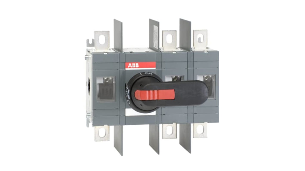 Sezionatore con interruttore ABB, 3 poli, corrente massima 400A, corrente nominale fusibile 400A, azionamento anteriore, impugnatura e albero neri, grado di protezione IP65, kit di bulloni per morsettiera incluso, montaggio su base, serie 1SCA02, integrato, tipo Sezionatori c.a. - Manuale.