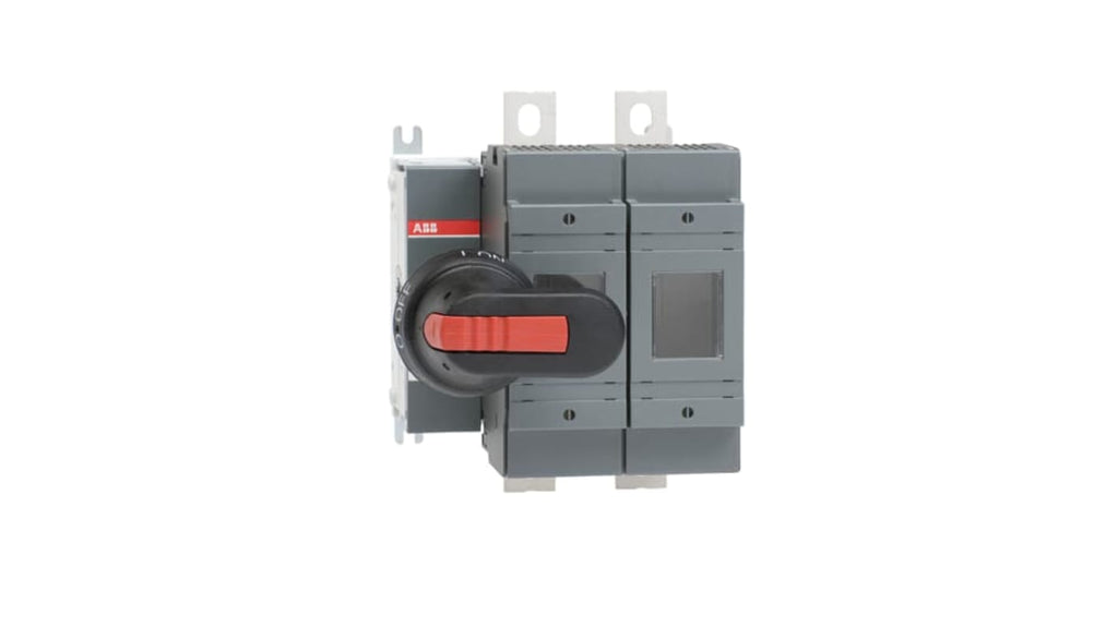 Sezionatore portafusibili ABB, 2 poli, fusibile 0-1, corrente nominale 250A, tensione nominale 500V, grado di inquinamento 3, impugnatura a pistola e albero inclusi, terminali a linguetta 25 mm, posizione terminali di linea Top in - Bottom out, Bottom in - Top out, meccanismo di azionamento 02 (lato sinistro).
