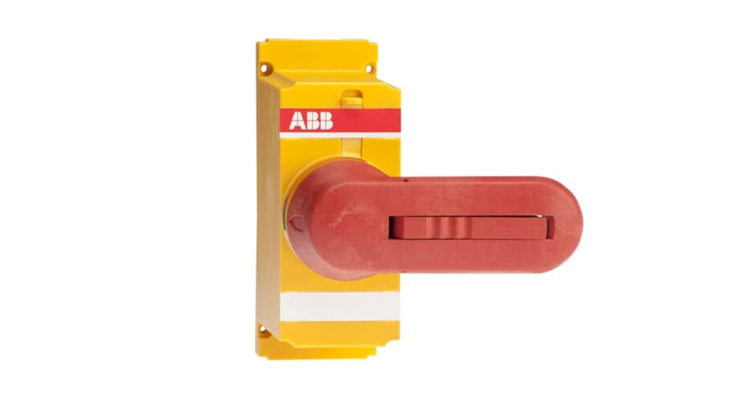 Manopola rotante per fusibili interruttore. Dimensioni 50x100x50 mm, peso 0,34 kg. Colore rosso/giallo, serie OSVY. Progettata per uso con fusibili interruttore. Codice costruttore 1SCA022779R5590 S/APP. OSVY400DK.
