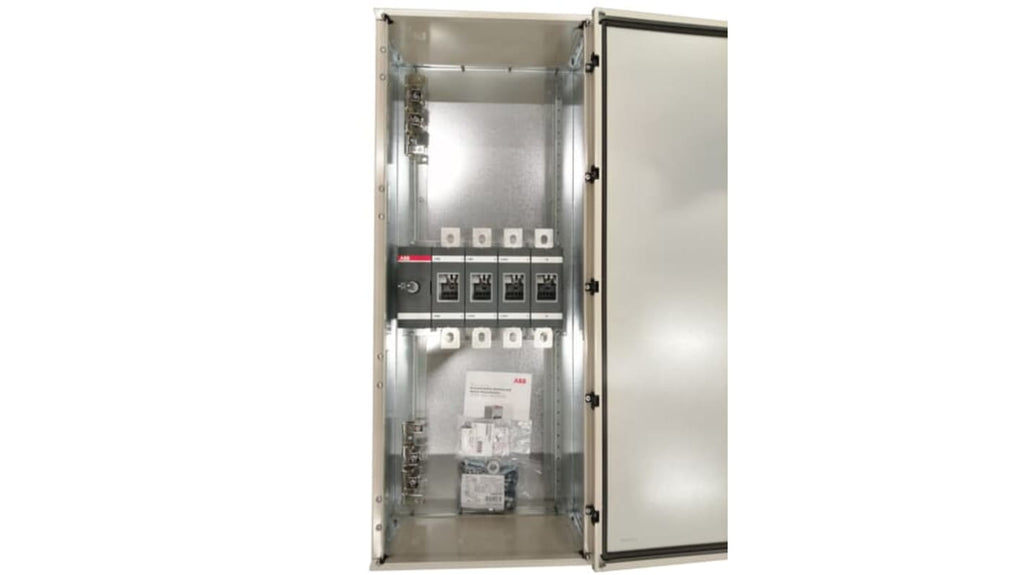 Sezionatore con interruttore, 4 poli, corrente massima 570A, tensione nominale 1000V, potenza nominale 560kW, configurazione 2NA e 2NC, montaggio a vite, grado di protezione IP65, contenitore in acciaio galvanizzato con rivestimento in poliestere, predisposto per cavi singoli e paralleli, impugnatura bloccabile, coperchio interbloccato, funzione di interblocco bypassabile. Codice costruttore 1SCA022830R4490. Marchio ABB.