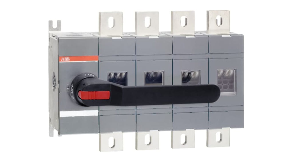 Sezionatore con interruttore ABB, 4 poli, corrente massima 1250A, tensione d'esercizio nominale 1000V, montaggio a vite, terminali di linea Top in - Bottom out e Bottom in - Top out, terminali ad aletta, grado di inquinamento 3, protezione IP00 e IP65, potenza nominale 1200kW, configurazione stato normale NO, serie OT. Codice costruttore 1SCA022860R6310.