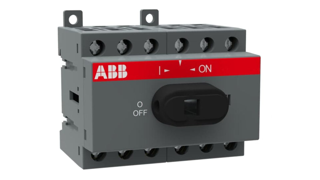 Sezionatore con interruttore ABB, 6 poli, corrente massima 16A, montaggio su base, grado di protezione IP20, potenza nominale 7,5kW, modello OT16F6. Disconnettore non fusibile con terminali a morsetto protetti, azionamento frontale. Maniglia e albero non inclusi.