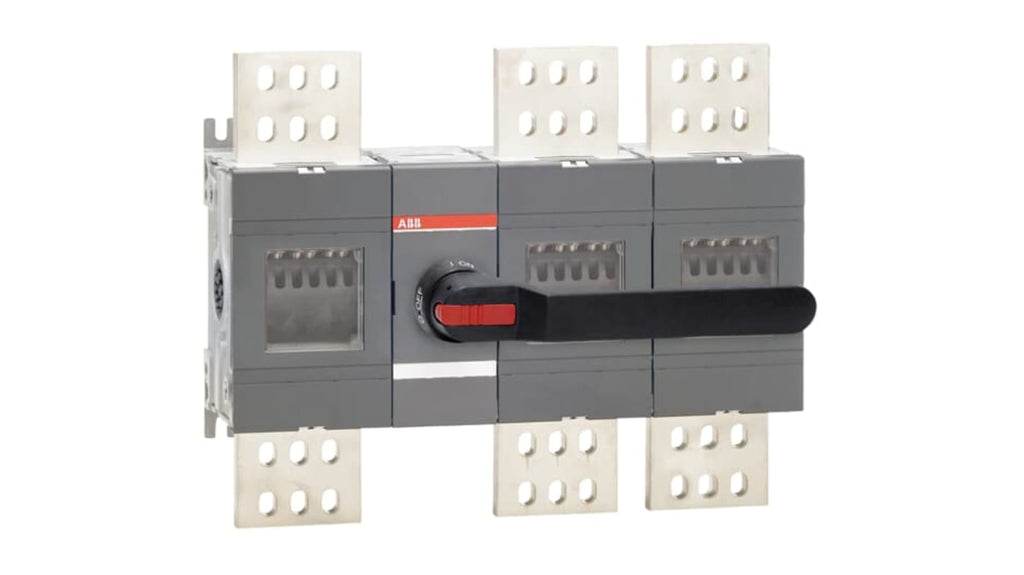 Sezionatore con interruttore ABB, 3 poli, corrente massima 2500A, corrente nominale fusibile 2.5kA, azionamento anteriore, impugnatura e albero neri, grado di protezione IP65, kit di bulloni per morsettiera incluso, terminali a occhiello, montaggio su base, serie 1SCA10, modello manuale.