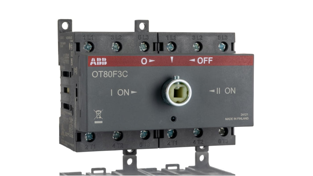 Interruttore commutazione ABB, serie OT, 3 poli, corrente massima 80A, tensione nominale 690V ca, potenza nominale 37kW, montaggio su base OT80F3C, grado di protezione IP20, dimensioni 85mm x 105mm x 92mm, colore maniglia nero. Progettato per applicazioni industriali e sistemi di automazione.
