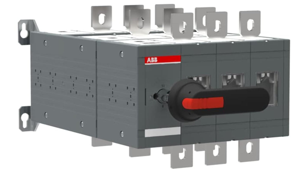 Sezionatore con interruttore ABB, corrente massima 800A, integrato, 3 interruttori di bypass manuali, impugnatura a pistola in plastica nera, grado di protezione IP65, montaggio su base, set di albero e bulloni per collegamento cavo, serie 1SCA12.