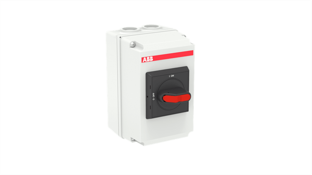 Sezionatore con interruttore, 4 poli, corrente massima 32A, montaggio a vite, protezione IP65, contenitore in policarbonato rinforzato con fibra di vetro, resistente ai raggi UV, ingressi cavo filettati per 2 cavi paralleli, configurazione stato normale NO, modello 1SCA125093R1001, serie OT.