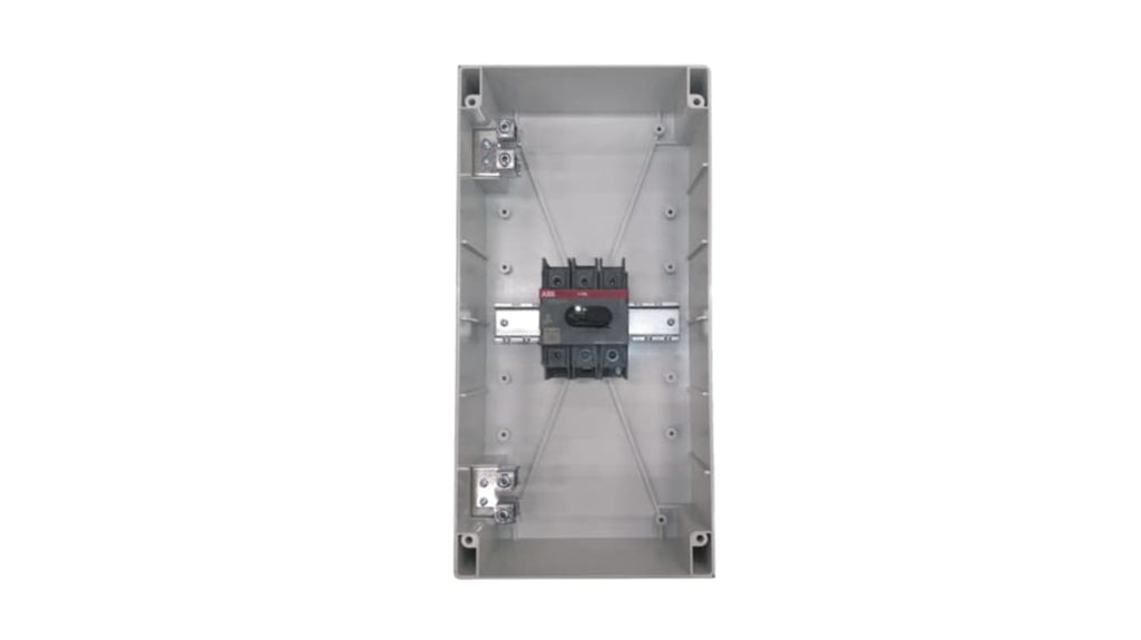 Sezionatore con interruttore ABB serie OTP, 3 poli, normalmente aperto, corrente massima 100A, montaggio a vite, protezione IP65, contenitore rigido in policarbonato rinforzato con vetro, resistente ai raggi UV, progettato per uso esterno e interno, maniglia bloccabile con tre lucchetti, potenza nominale 37kW. Codice costruttore 1SCA126056R1001.