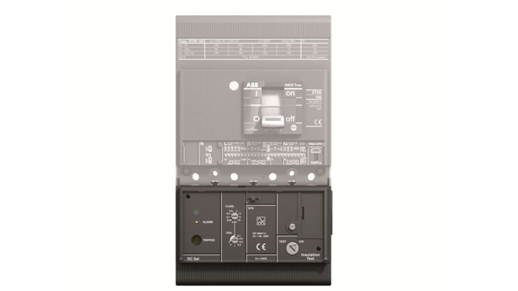 Interruttore magnetotermico scatolato a quattro poli, modello RC Sel XT2 F, codice 1SDA067126R1, marchio ABB. Rilascio di corrente residua RC, dimensioni 160 x 190 x 160 mm. Specifiche tecniche: Gamma, Tmax XT, Serie 1SDA06.
