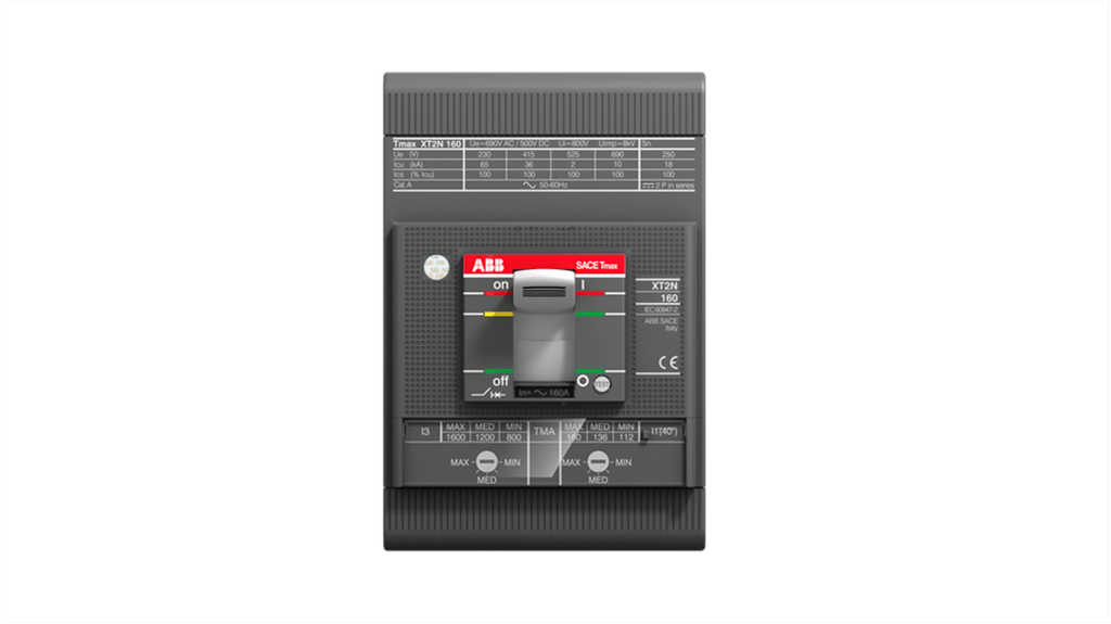 Interruttore magnetotermico scatolato, 3 poli, corrente nominale 25 A, tensione nominale 690 V, frequenza 50/60 Hz, tipo di rilascio termomagnetico TMG, tensione di resistenza agli impulsi 8 kV, montaggio fisso, marchio ABB, codice costruttore 1SDA067740R1 XT2S 160 TMG 25A FF.