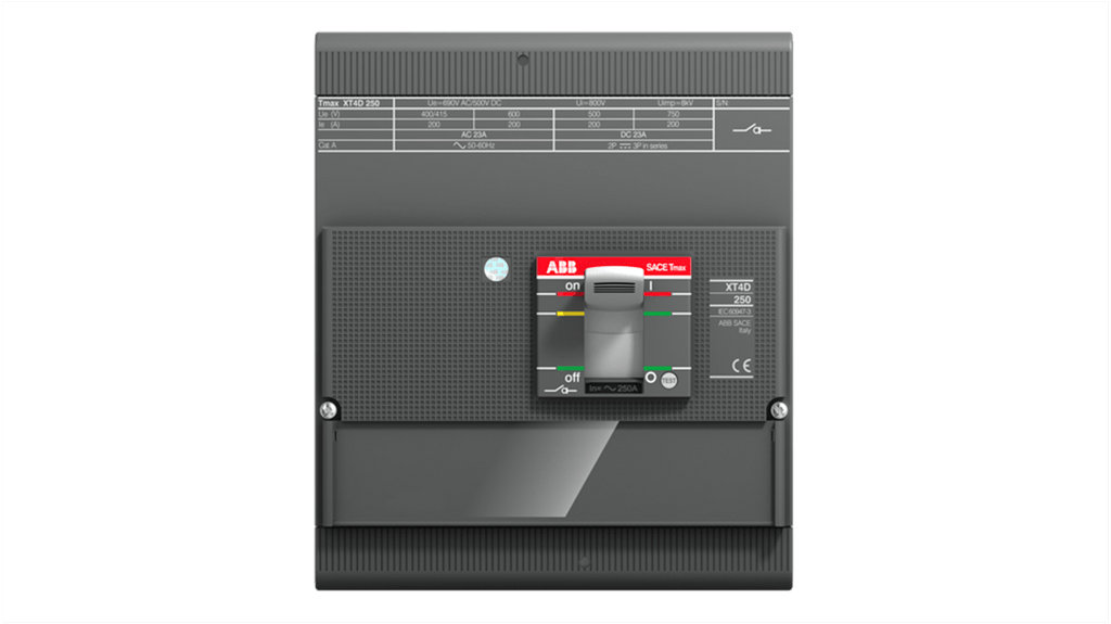 Sezionatore con interruttore ABB, 4 poli, corrente massima 250A, montaggio superficiale, serie XT4D, conforme agli standard IEC, terminali anteriori. Modello 1SDA068213R1.