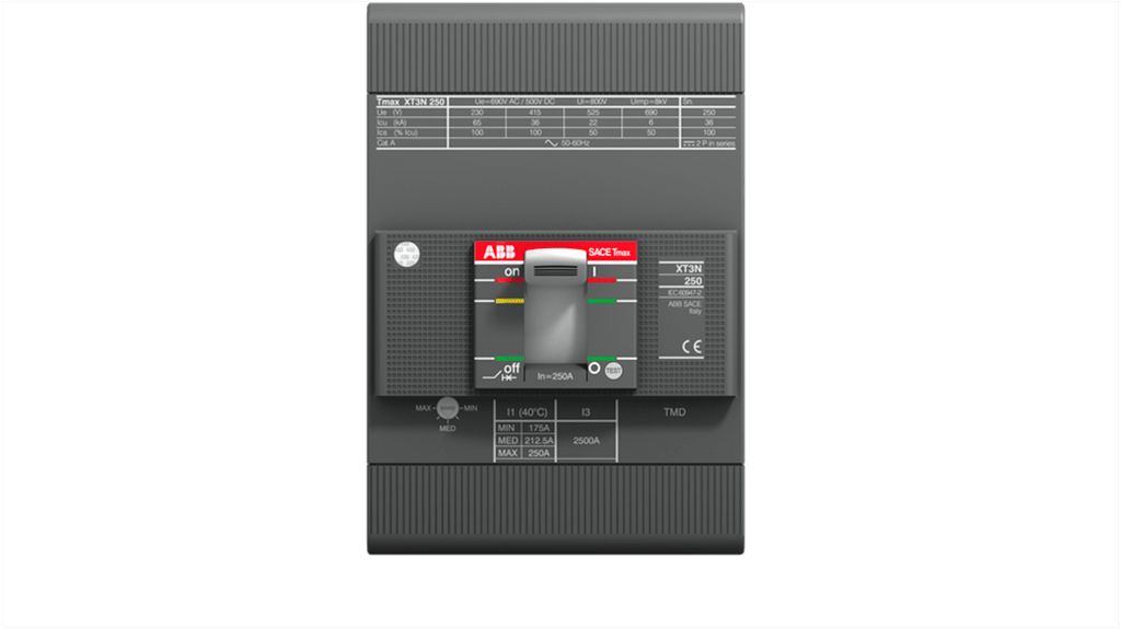 Interruttore magnetotermico scatolato, corrente nominale 200A, 3 poli, potere di interruzione 37,5 kA, tensione nominale CA 690V, tensione nominale CC 500V, tipo di montaggio fisso, tipo di contatto terminale bullone, dimensioni 70mm x 105mm x 150mm, codice costruttore 1SDA068256R1 XT3N 250 TMG 200A FF, marchio ABB.