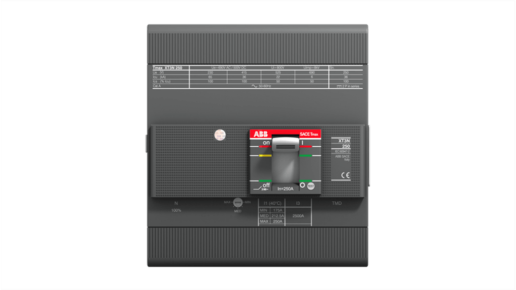 Interruttore magnetotermico scatolato, 4 poli, corrente nominale 80 A, tensione d'esercizio 690 V c.a., tensione di isolamento nominale 1000 V, tensione di resistenza agli impulsi 8 kV, rilascio termomagnetico, tipo di montaggio fisso, intervallo di impostazione 56...80 A, livello di prestazioni in cortocircuito S, codice costruttore 1SDA068273R1 XT3S 250 TMG 80A FF, marchio ABB.