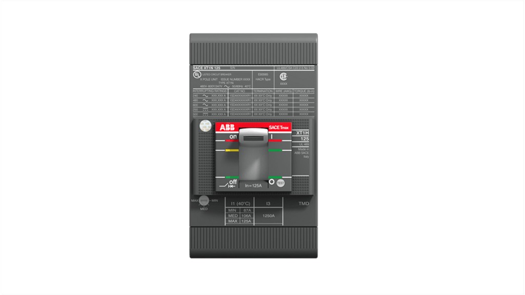 Interruttore automatico con contenitore stampato, corrente nominale 50 A, 3 poli, montaggio fisso, gamma SACE Tmax XT, serie XT1N, eccellenti proprietà di isolamento, elevata capacità di corto circuito, resistenza agli urti e vibrazioni, funzione di connettività integrata. Marchio ABB, codice costruttore 1SDA074641R1 XT1N 125 TMF 50-500 3p F F.