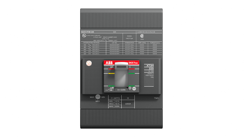 Interruttore automatico MCCB, 150A, montaggio fisso, 3 poli, certificato UL/CSA, tensione nominale fino a 600Y/347V, progettato per circuiti CA e CC, impostazione della corrente di cortocircuito migliorata, dimensioni 70mm x 105mm x 150mm, tipo di contatto terminale bullone, codice costruttore 1SDA075115R1 XT3N 225 TMF 150-1500 3p F, marchio ABB.