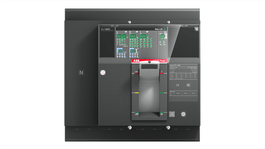 Interruttore magnetotermico scatolato, 4 poli, corrente nominale 1600 A, tensione nominale 690 V, frequenza 50/60 Hz, tensione di tenuta ad impulso 8 kV, tipo di montaggio fisso, terminali frontali, relè a stato solido Ekip LS/I, serie Tmax XT. Codice costruttore 1SDA101117R1 XT7S1600 EkipDip LS/I 4pFF, marchio ABB.
