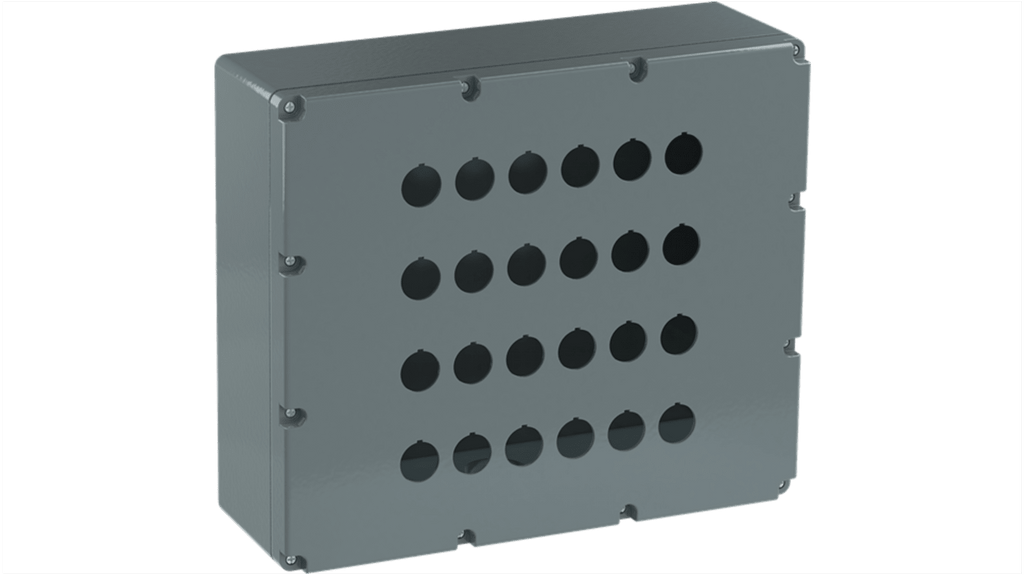 Scatola per pulsante vuota a 24 fori, realizzata in alluminio, dimensioni 257 x 300 x 101,5 mm, grado di protezione IP66, colore grigio, ingresso per cavo. Specifiche: serie Modular Metal, numero di fori 24, materiale contenitore alluminio, colore contenitore grigio.