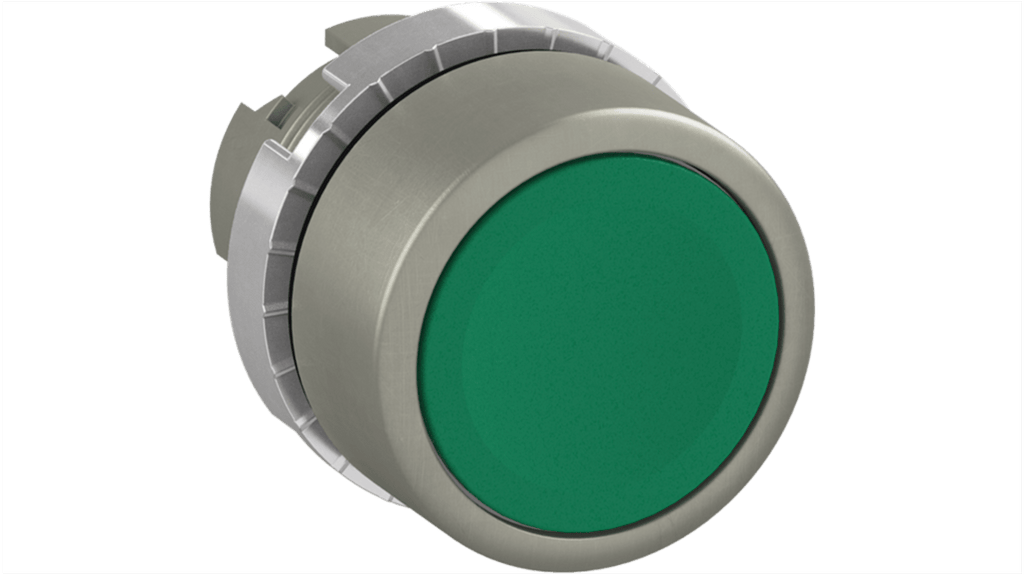 Pulsante tipo Instabile ABB, attuatore a filo, colore verde, forma rotonda, grado di protezione IP66 sul lato anteriore, serie 1SFA1. Funzione momentanea, progettato per applicazioni industriali.