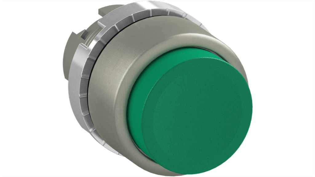 Pulsante a fungo instabile, attuatore esteso, colore verde, forma rotonda, grado di protezione IP66 sul lato anteriore. Prodotto della serie 1SFA1, marchio ABB.