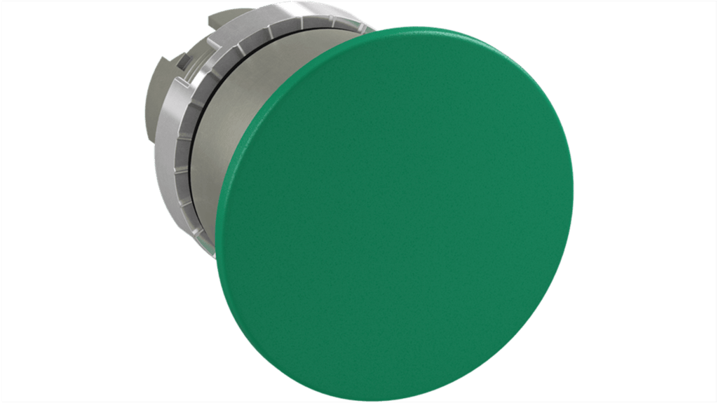 Pulsante a fungo instabile, diametro 40 mm, colore verde, attuazione momentanea. Grado di protezione IP66 sul lato anteriore. Marchio ABB, serie 1SFA1. Design robusto per applicazioni industriali.