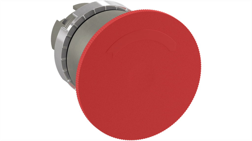 Pulsante a fungo con attuazione a rilascio a rotazione, colore rosso, diametro attuatore 40 mm, grado di protezione IP66 sul lato anteriore. Prodotto della serie 1SFA1, marchio ABB.